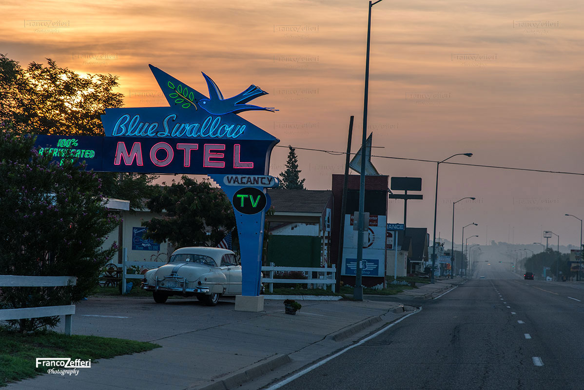 Esco dal motel quando il neon è ancora acceso e con la temperatura decisamente fresca, scelgo il lato della Route 66, rispetto al Blue Swallow, dove passeggiare e, con la macchina fotografica al collo, comincio a camminare avvolto dal silenzio di una comunità ancora dormiente.