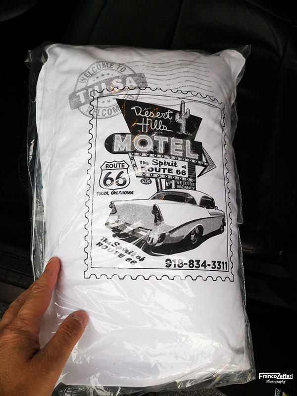 Alla partenza, appena entrato nella reception per restituire le chiavi, la titolare allunga le mani verso di me per porgermi un cuscino bianco con la serigrafia della splendida insegna del motel.
