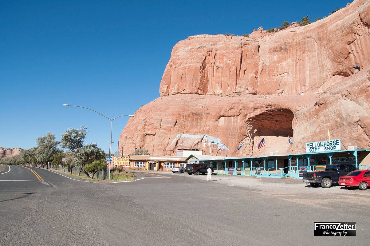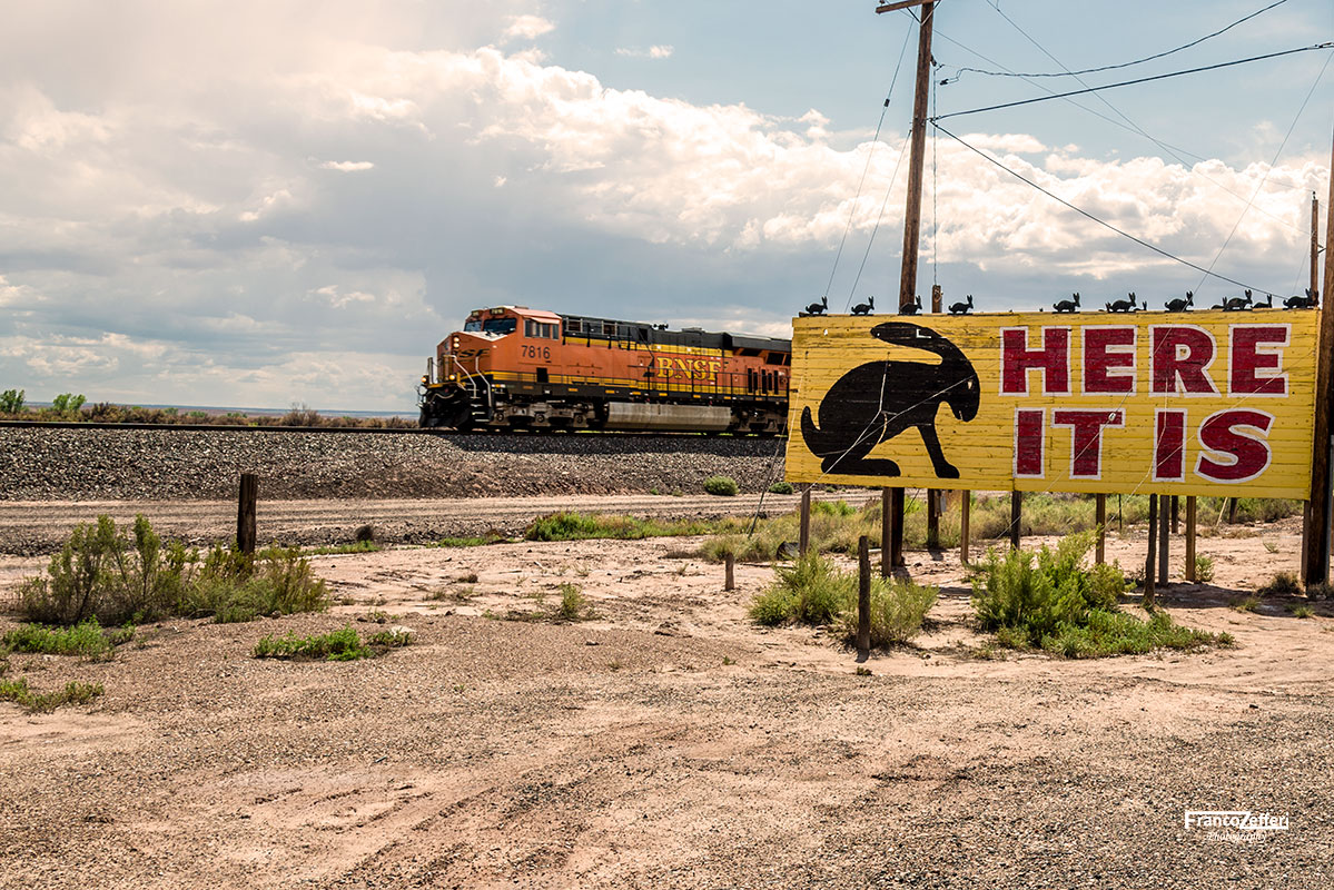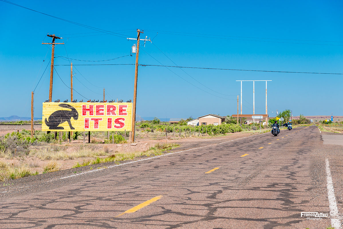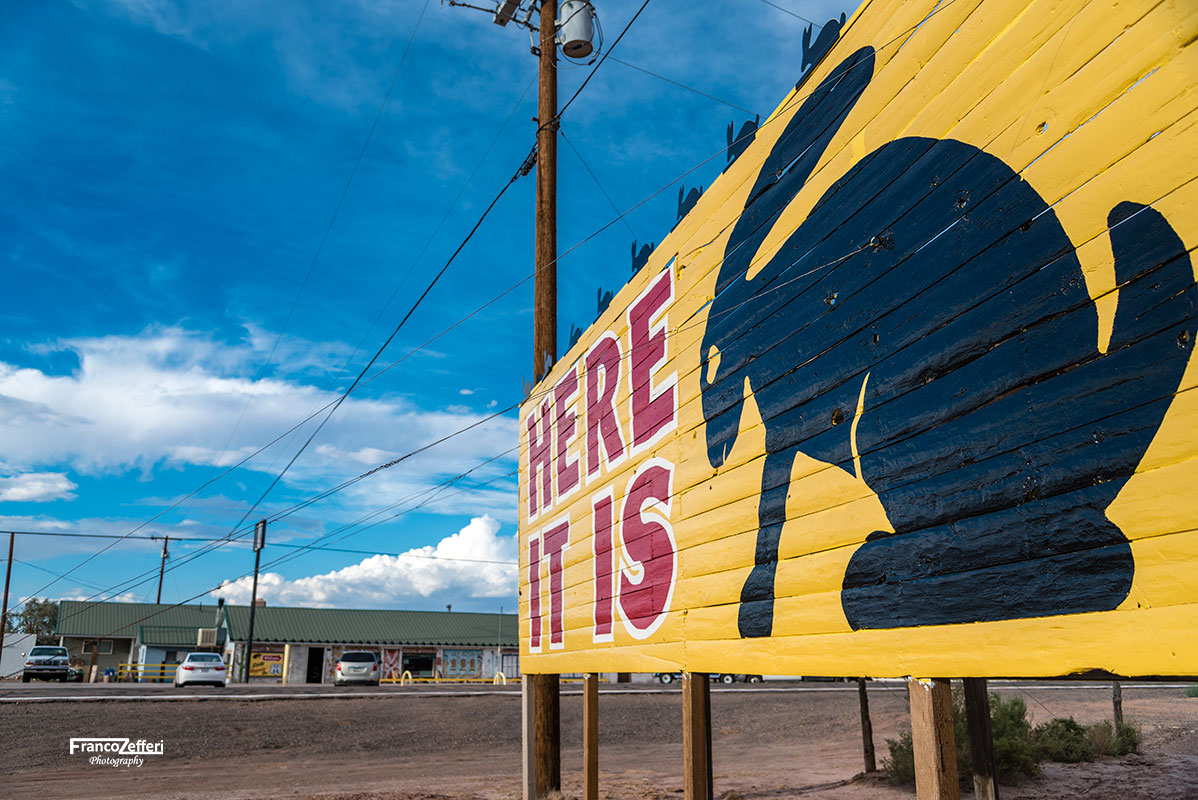 Il cartello giallo del negozio di Lizzie con la scritta “Here it is” è una delle icone della Mother Road. Si trova di fronte al Jackrabbit Trading Post a Joseph City in Arizona.