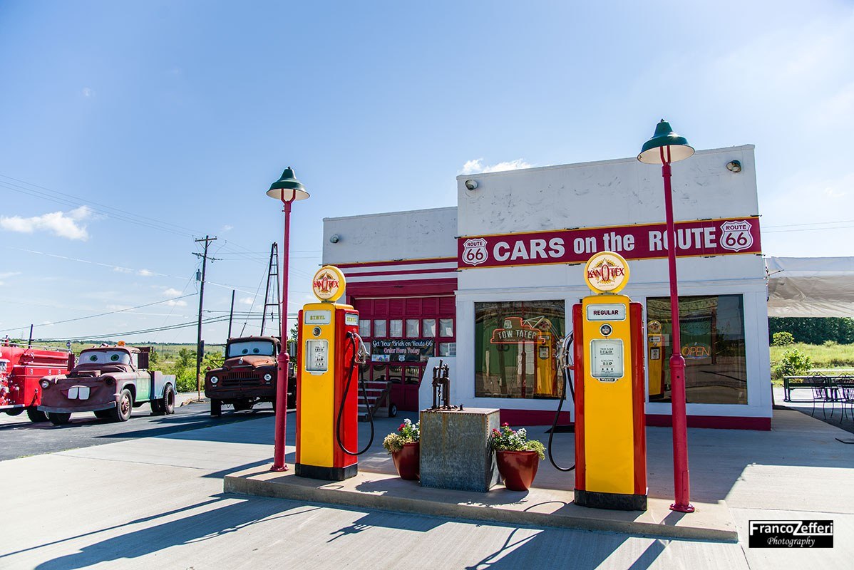 Il Cars on the Route (la “casa” di Cricchetto) è un gift shop/diner che occupa quella che un tempo è stata la Kan-O-Tex Filling Station (e successivamente Little’s Service Station), una stazione di servizio costruita verso la fine degli anni 20.