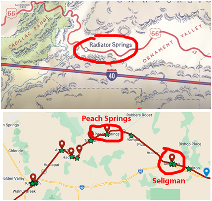 Seligman fornisce a Radiator Springs i colori, la collocazione in mezzo al nulla, in parte lo scenario che la circonda, ma la piccola cittadina di fantasia è tutta la Route 66, da est ad ovest.