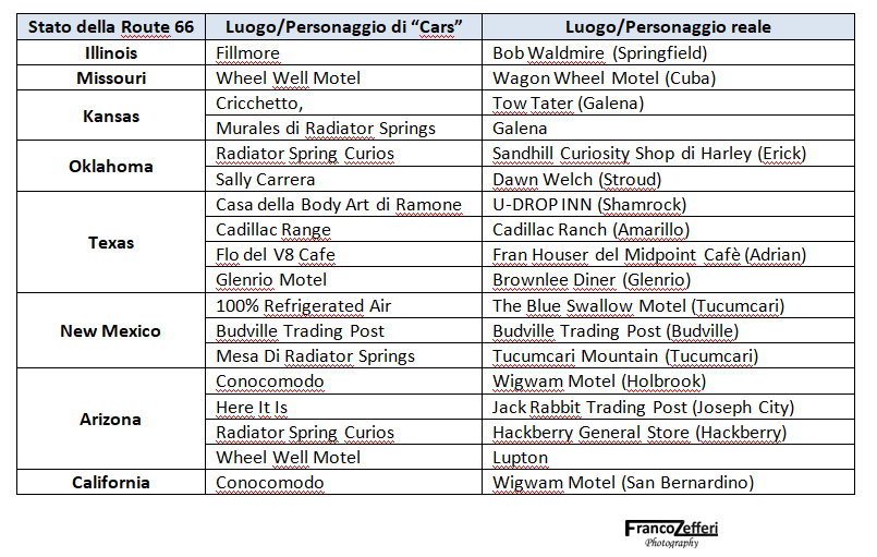 Questi, come detto, sono i riferimenti più popolari di Cars alla realtà della Route 66; nella tabella seguente ne è riportata una sintesi: