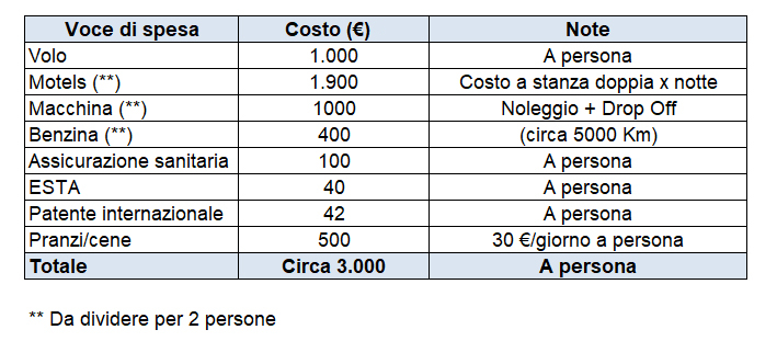 Volendo fare una stima dei costi finali, considerando 2 persone e quindi dividendo per 2 alcune spese (motels, macchina e benzina) siamo intorno ai 3.000 Euro a persona esclusi gli extra.