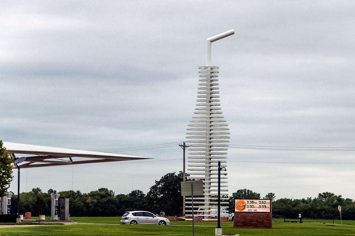Ma durante il viaggio, peraltro in un ennesimo tratto stupendo di Route 66 immerso nel verde, ho notato delle curiose costruzioni: una piccola balena blu (come la Blue Whale di Catoosa), due frecce piantate per terra (come le Twin Arrows dell’Arizona).